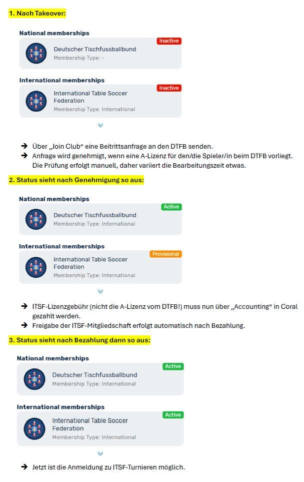 Für die Teilnahme an ITSF‑Turnieren ist eine eigenständige Registrierung über Coral erforderlich. Voraussetzung für die Anmeldung über Coral ist eine aktive Mitgliedschaft (Status „Active“, grün markiert) sowohl beim Deutschen Tischfußballbund als auch bei der International Table Soccer Federation. Die Aktivierung der Mitgliedschaften (Join Club DTFB) muss jedes Jahr erneut erfolgen, da vor der Freischaltung das Vorhandensein einer gültigen A‑Lizenz überprüft wird. Der ITSF erhebt zudem eine Jahres-Lizenzgebühr, die über Coral zu zahlen ist. Diese Gebühr ist auch im Jahr 2026 unabhängig von der A-Lizenz des DTFB.