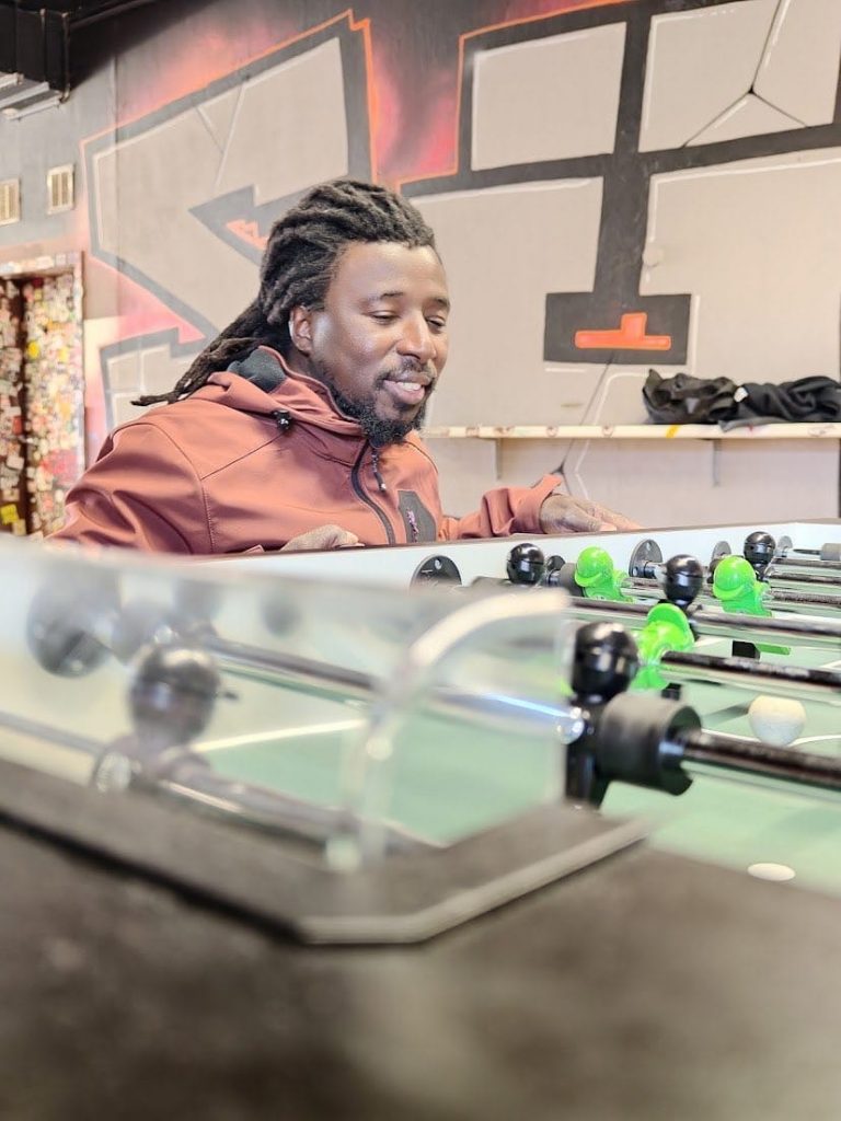 Danach wurden auf der Südtribüne an speziellen Rollstuhl Kickertischen die Stangen gedreht. Insgesamt 16 Rollstuhl-Kids konnten ihre Kicker-Skills unter Beweis stellen und ihre Chancen auf dem Transfermarkt als Talent entdeckt zu werden immens erhöhen. Als Belohnung gab es anschließend ein reichhaltiges Mittags-Büffet im Stadion des FC Sankt Pauli. 🤎🤍♥️